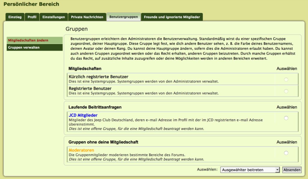 Da Du und Ernie die Admins sind, müsste ich ja eigentlich ein Normalo sein. Aber warum kann ich dann unter Persönlicher Bereich -> Benutzergruppen meine Mitgliedschaft ändern?