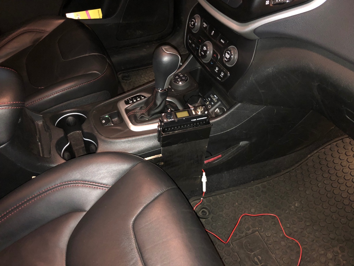 Da es keinen schönen Einbauplatz gab steckt das Funkgerät jetzt auf einem Brett am Beifahrersitz, Kabel einstecken, Magnetantenne aufs Dach, fertig.