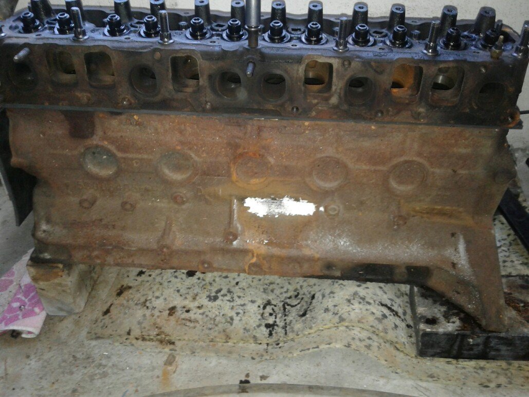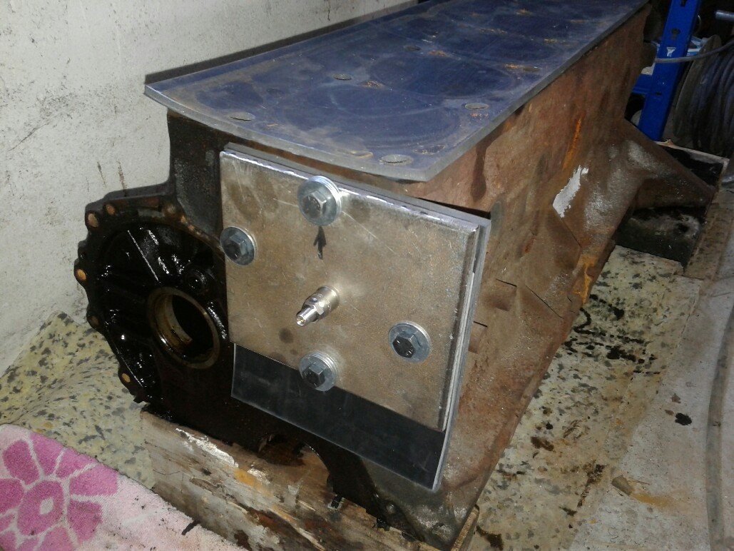 ich stand kürzlich vor der Aufgabe bei einem 4.0l Motor zu prüfen ob eine auffällige Kante seitlich im Motorblock nur eine unsaubere Gusskante oder ein Riss mit Kühlwasserverlust ist. So etwas macht gewöhnlich auch jeder Motorinstandsetzer aber da war die Aussage " mal schauen ob wir da passende Platten zum Dichten haben, sonst müssen wir was anfertigen...". KeinProblem,kostet aber schnell extra. Also hab ich schnell eigenes Dichtmaterial angefertigt. Die Zylinderkopfdichtung wurde durch 5mm Gummi ersetzt und nur Löcher für die Kopfschrauben ausgestanzt,der Zylinderkopf dient dann als oberer Deckel. Die einzig weitere Öffnung ist die zur Wasserpumpe. Hier habe ich eine Stahlplatte mit Löchern an den Originalverschraubpunkten der Wapu und zusätzlich mittig ein schraubbares Reifenventil verbaut. Das ganze wieder mit 5mm Gummi abgedichtet, fertig. In meinem Fall habe ich den Block mit Wasser gefüllt und dann mit ca 2.5bar abgedrückt. Die verdächtige Stelle vorher mit trochener Kreide behandelt, die Undichtigkeit in meinem Fall wäre aber auch so erkennbar gewesen. Noch optimaler wäre die Prüfung mit Luft und den Block in einen Behälter mit ca 80 Grad warmem Wasser zu legen,hat man fast Betriebstemperatur...