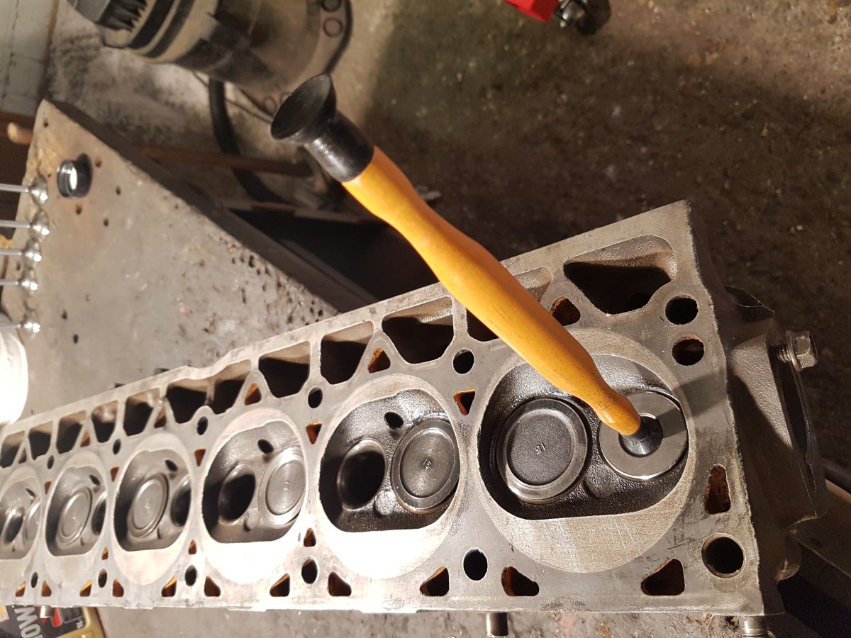Ich mache mich jetzt daran, die Ventile auszubauen, und den Kopf erst mal sehr ordentlich zu reinigen, und natürlich zu schauen, ob er schön plan ist, aber ich gehe stark davon aus, dass er das ist. Leider sind die Ventilkeile mit dem Ventil /- Federteller dermaßen wie verschweisst, dass ich mir was einfallen lassen muss, diese voneinander zu lösen. Bei EINEM Ventil hat es bereits geklappt. Das richtige Werkzeug (einen Valve-spring-compressor) habe ich natürlich im Einsatz. Er funktioniert auch RICHTIG GUT, aber eben die festsitzenden Ventilkeile sind eine Herausforderung...