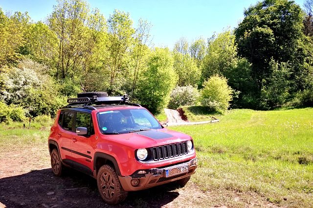 Jeep Renegade Trailhawk, Omaha Orange, Höherlegung, größere ATs, Dachkorb und Zusatzscheinwerfer etc..