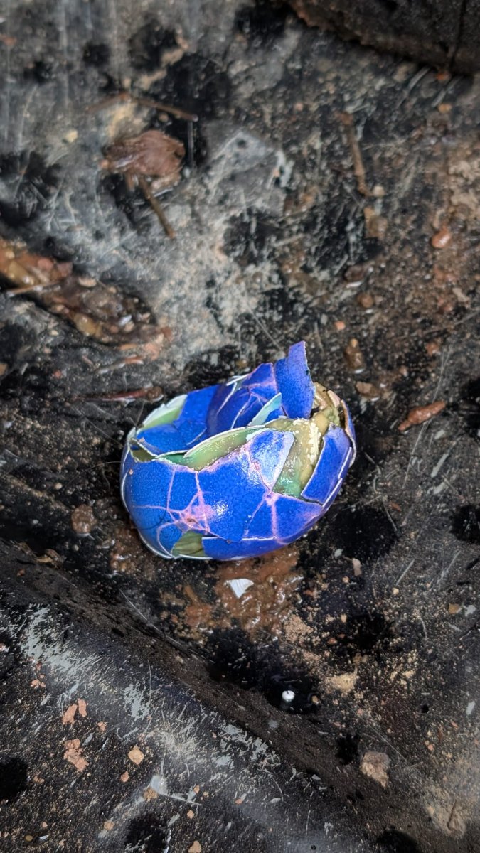 Nach einer Woche Überlegung, ob sich eine Reinigung lohnt, entfernte ich dann doch gestern und heute die Verunreinigungen. Dazu entnahm ich auch die Schmutzfangschalen im Fußraum. Beifahrerseitig fand ich dahinter zur Überraschung ein außen blau gefärbtes, innen aber grünliches Osterei.