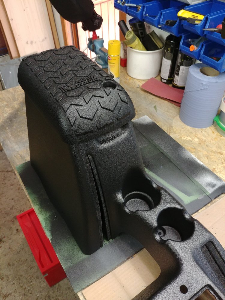 Da der Innenraum eh schwarze Teppiche bekommt (sind bereits da), habe ich die Konsole wie die äußeren schwarzen Anbauteile mit U-Pol Raptor beschichtet.
