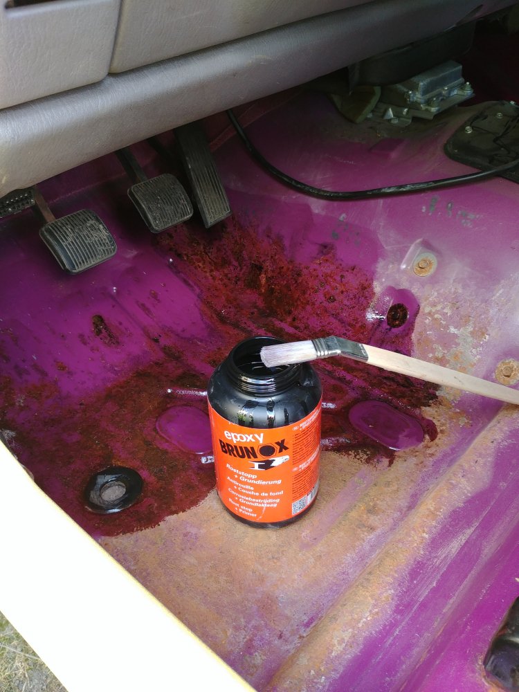 Also alles schön abgebürstet und gereinigt. Anschließend Rostumwandler mit Epoxi-Grundierung aufgebracht.