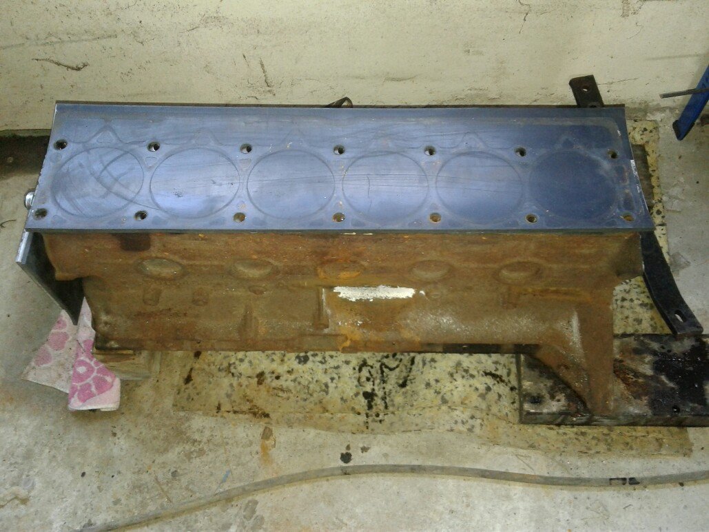 ich stand kürzlich vor der Aufgabe bei einem 4.0l Motor zu prüfen ob eine auffällige Kante seitlich im Motorblock nur eine unsaubere Gusskante oder ein Riss mit Kühlwasserverlust ist. So etwas macht gewöhnlich auch jeder Motorinstandsetzer aber da war die Aussage " mal schauen ob wir da passende Platten zum Dichten haben, sonst müssen wir was anfertigen...". KeinProblem,kostet aber schnell extra. Also hab ich schnell eigenes Dichtmaterial angefertigt. Die Zylinderkopfdichtung wurde durch 5mm Gummi ersetzt und nur Löcher für die Kopfschrauben ausgestanzt,der Zylinderkopf dient dann als oberer Deckel. Die einzig weitere Öffnung ist die zur Wasserpumpe. Hier habe ich eine Stahlplatte mit Löchern an den Originalverschraubpunkten der Wapu und zusätzlich mittig ein schraubbares Reifenventil verbaut. Das ganze wieder mit 5mm Gummi abgedichtet, fertig. In meinem Fall habe ich den Block mit Wasser gefüllt und dann mit ca 2.5bar abgedrückt. Die verdächtige Stelle vorher mit trochener Kreide behandelt, die Undichtigkeit in meinem Fall wäre aber auch so erkennbar gewesen. Noch optimaler wäre die Prüfung mit Luft und den Block in einen Behälter mit ca 80 Grad warmem Wasser zu legen,hat man fast Betriebstemperatur...