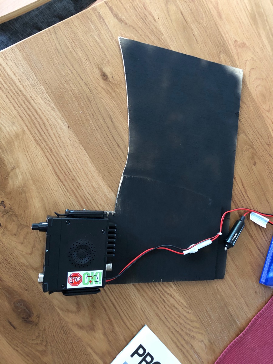 Da es keinen schönen Einbauplatz gab steckt das Funkgerät jetzt auf einem Brett am Beifahrersitz, Kabel einstecken, Magnetantenne aufs Dach, fertig.